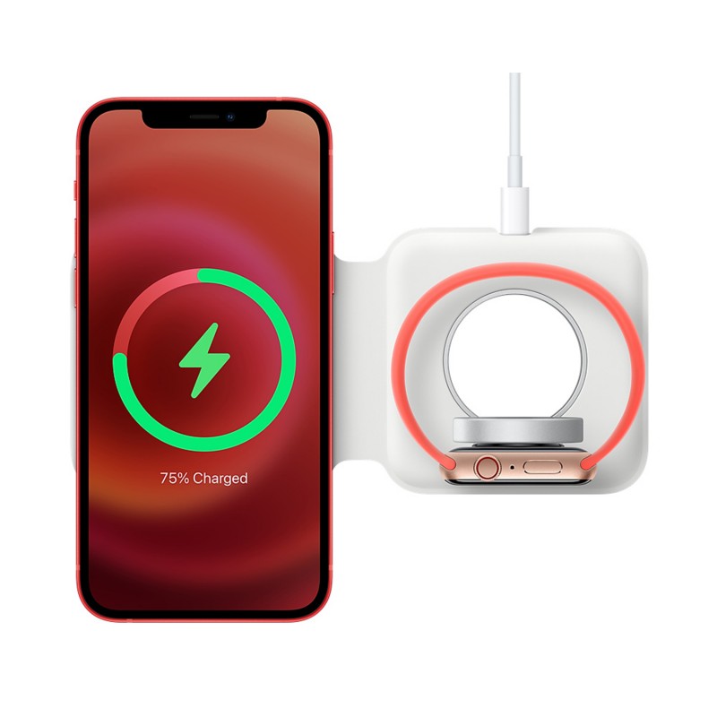 The MagSafe Duo Charger conveniently charges your compatible iPhone, Apple Watch, Wireless Charging Case for AirPods, and other Qi-certified devices. Just place your devices on the charger and a steady, efficient charge begins on contact. The charger folds together neatly so you can easily take it with you wherever you go.