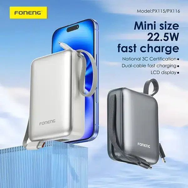 The FONENG PX116 is a compact yet powerful 20000mAh portable power bank designed for fast and efficient charging. With dual built-in cables (Type-C and Lightning), it offers convenience for users who need to charge their devices on the go without carrying extra cables. It supports multiple fast-charging protocols, ensuring compatibility with a wide range of devices, including smartphones, tablets, and other USB-powered gadgets.