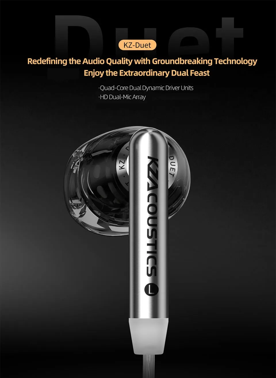 The KZ Duet wired earbud features quad-core dual dynamic drivers (10 mm + 8 mm) delivering deep, immersive bass, smooth mids, and sparkling highs for a balanced HiFi experience. Engineered with Super-Stroke bass compensation architecture and a precision acoustic crossover, it ensures tight, controlled low-end, clear instrument separation, and accurate tonality. Equipped with dual 6 mm condenser microphones with noise reduction, this earbud captures crystal-clear voice for calls, gaming, and streaming. Its semi-in-ear ergonomic design with soft anti-slip silicone eartips provides a comfortable, secure fit for long listening sessions, while the silver-plated cable and universal 3.5 mm connector offer plug-and-play compatibility with smartphones, PCs, tablets, and gaming consoles, making it a versatile, high-performance wired earbud with mic for audiophiles and casual users alike.