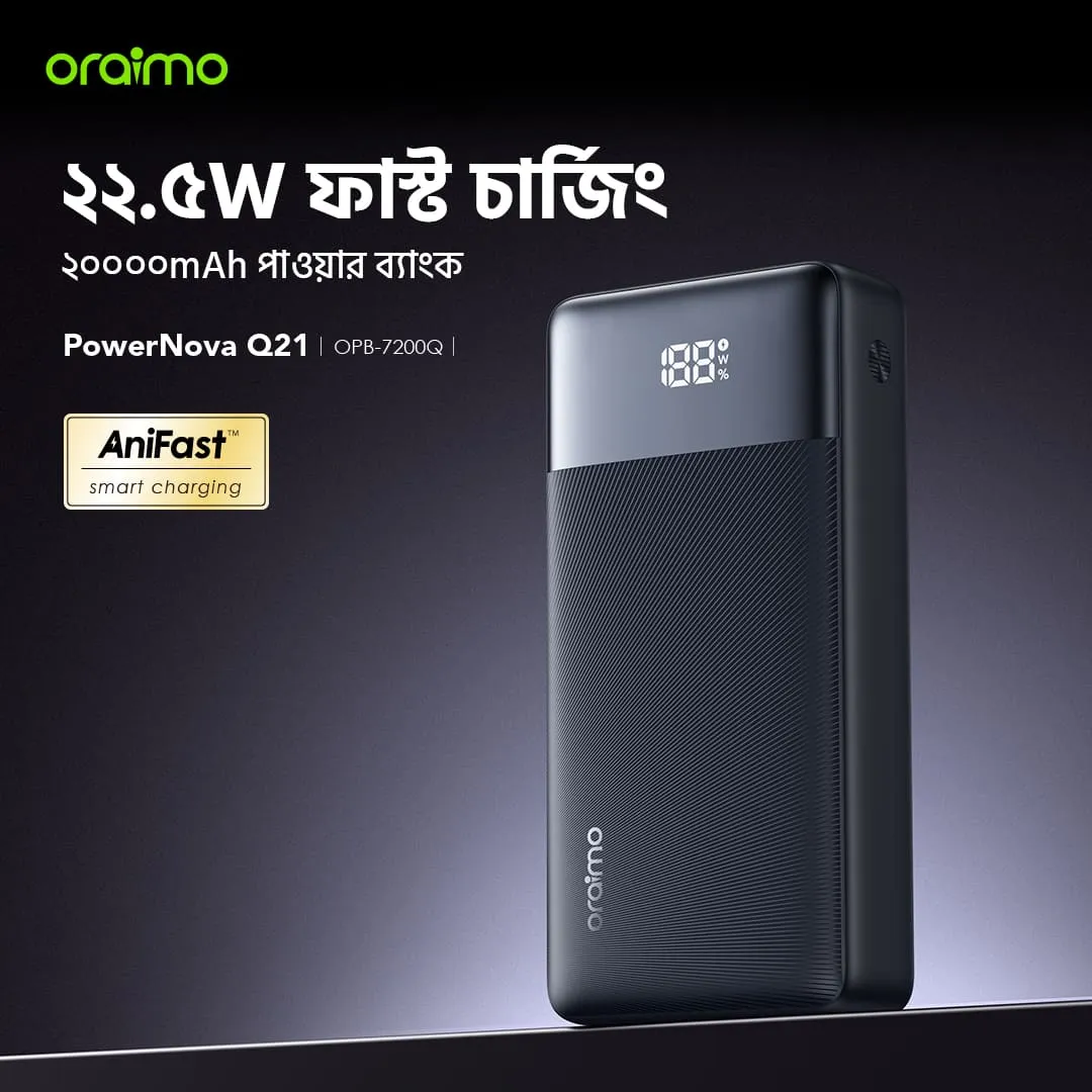 Stay powered up on the go with the Oraimo PowerNova Q21—a sleek and powerful 20000mAh power bank designed to deliver fast, safe, and efficient charging. With 22.5W Super Fast Charging, triple output ports, and a smart digital display, it’s built for modern devices and heavy daily use.
