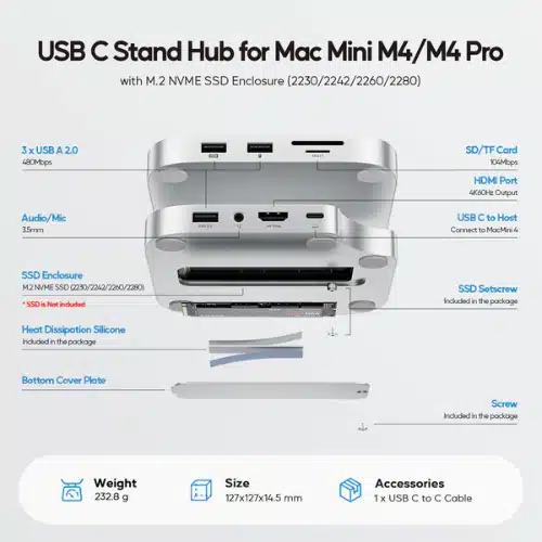 ✔ Multi-Functional Hub Stand – Doubles as a sleek stand for Mac mini M4/M4 Pro with integrated ports for enhanced connectivity.