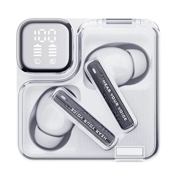 The sleek, fully transparent cyberpunk-style charging case and tech-inspired earbud stems design make QCY MeloBuds Neo a fashionable accessory that truly stands out. - Smart Power Display